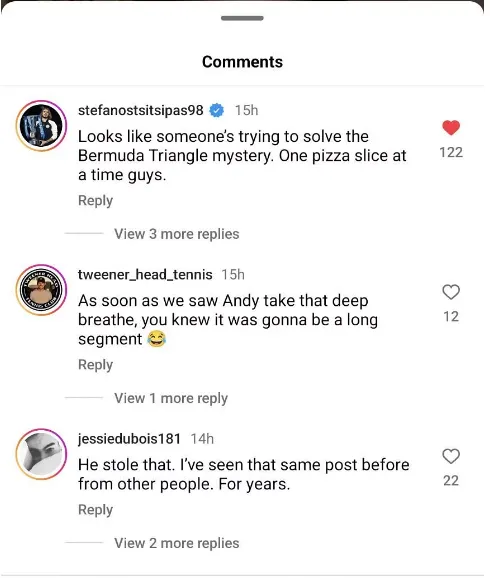 "Parece que alguien intenta resolver el misterio del Triángulo de las Bermudas. Una porción de pizza cada vez, chicos", escribió Stefanos Tsitsipas.