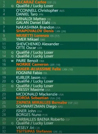 Mientras Dan Evans se enfrentará a Thanasi Kokkinakis, Denis Shapovalov se enfrenta a Brandon Nakashima, Alejandro Davidovich Fokina se enfrenta a la esperanza local Arthur Fils. Ben Shelton, contraLorenzo Sonego. Alexander Zverev comienza contra Lloyd Harris un año después de su horrible lesión contra Nadal.