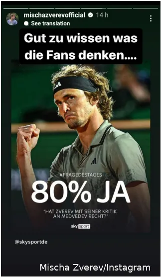 La encuesta fue realizada por Sky Sports Alemania, lo que explicaría el resultado sesgado del 80% de apoyo a Zverev. El propio Mischa subtituló el post: "Es bueno saber lo que piensan los aficionados....".