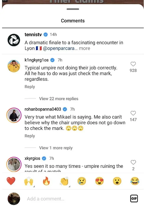 cierto lo que dice Mikael. Yo tampoco puedo creer por qué el juez de silla no baja a comprobar la marca", comentó Rohan Bopanna en el post de Krygios.