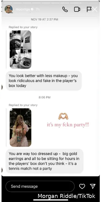 Otro dijo: "Estás demasiado arreglada -grandes pendientes de oro y todo- para estar sentada durante horas en el palco de jugadores, ¿no crees? Es un partido de tenis, no una fiesta". Riddle, con razón, respondió: "¡¡¡Es mi puta fiesta!!!".