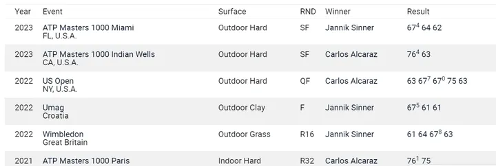 Carlos Alcaraz, sin embargo, se llevó los dos anteriores ganando 7-6, 6-3 en Indian Wells y en el US Open en 2022 ganando 6-3, 6-7, 6-7, 7-5, 6-3.