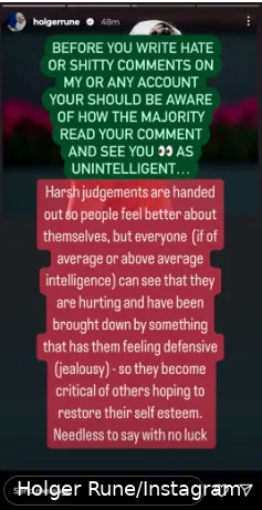 Pues bien, el tenista danés utilizó su Instagram para arremeter contra los 'haters' con una historia de Instagram lanzándoles unos cuantos insultos. Rune escribió: "Antes de escribir comentarios de odio o de mierda en mi cuenta o en cualquier otra, deberías ser consciente de cómo la mayoría lee tu comentario y te ve como poco inteligente... Se emiten juicios duros para que la gente se sienta mejor consigo misma, pero todo el mundo (si tiene una inteligencia media o superior a la media) puede ver que están sufriendo y que han sido derribados por algo que les tiene a la defensiva (celos), así que se vuelven críticos con los demás con la esperanza de restaurar su autoestima". Ni que decir tiene que sin suerte".