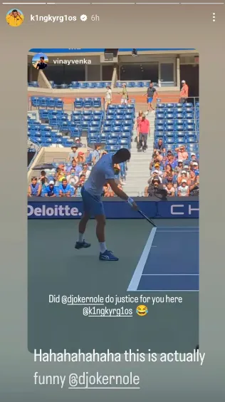 El propio Kyrgios pareció disfrutar con las imitaciones de Djokovic, ya que subió a las redes sociales varios fragmentos del vídeo captados por los aficionados. "Hahahahahaha esto es realmente gracioso", escribió en el pie de foto de una de sus historias de Instagram.