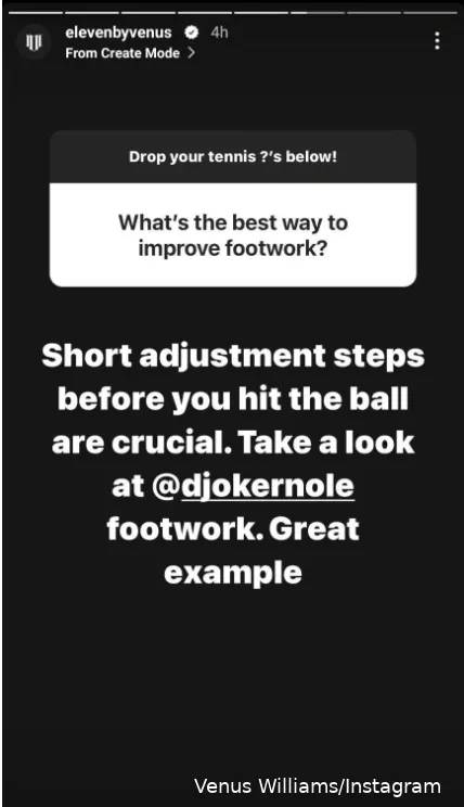 Durante una sesión de preguntas y respuestas en Instagram, Williams señaló la importancia de dar pasos cortos de ajuste antes de golpear la pelota. Aconsejó a los jugadores ocasionales y a los aspirantes a tenistas que observaran el juego de pies de Djokovic e implementaran su método en su propio juego.
