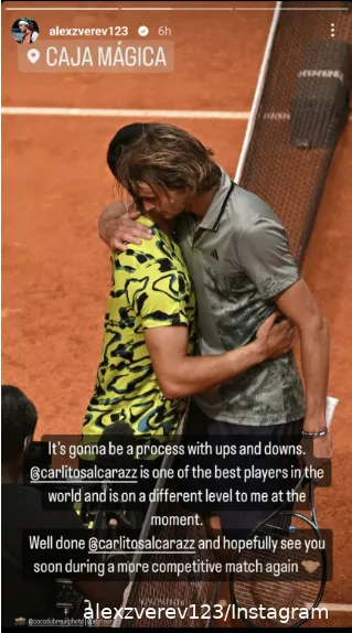 Zverev ya sabía lo que es jugar contra Alcaraz en Madrid, ya que perdió contra él en la final del año pasado. Este año no fue una final y no fue un partido competido en absoluto. Zverev era plenamente consciente de ello tras el partido proclamando a Alcaraz en una historia de Instagram en un nivel superior al suyo.
