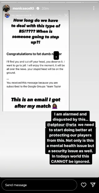 "Estoy alarmada y asqueada por esto...@atptour @wta tenemos que empezar a hacerlo mejor para proteger a nuestros jugadores de esto. No solo es un problema de salud mental sino también de seguridad. En el mundo de hoy esto NO PUEDE ser ignorado".
