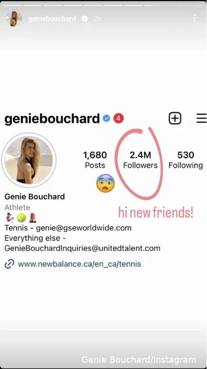 "Hola nuevos amigos", subtituló Bouchard su historia de Instagram, en la que aparecía una foto de su perfil con especial énfasis en el recuento de seguidores.