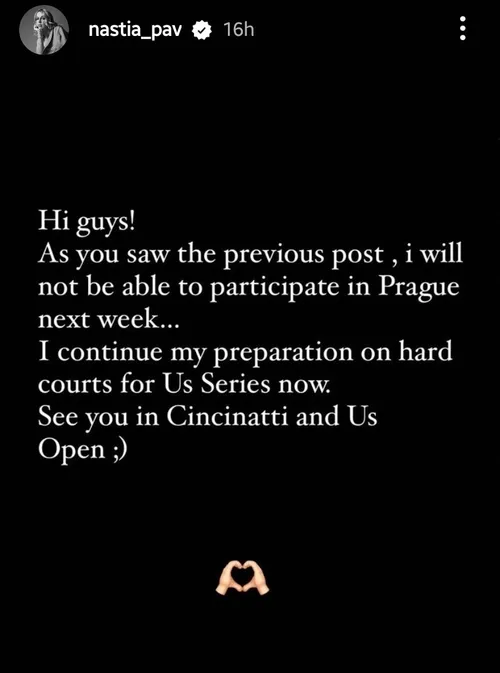 "¡Hola chicos! Como habéis visto en el post anterior, no podré participar en Praga la semana que viene. Ahora continúo mi preparación en pista dura para las US Series. Nos vemos en Cincinnati y en el US Open", escribió en Instagram.