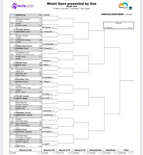 Se ha confirmado el cuadro WTA para el Miami Open 2023 que tendrá lugar entre el 21 de marzo y el 2 de abril de 203 como segunda parte del Sunshine Double.