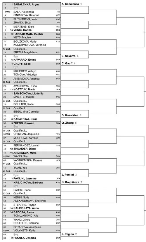 Jessica Pegula se enfrenta a Katie Volynets o Anastasia Potapova y es segunda cabeza de serie esta semana. Paula Badosa o Ajla Tomljanovic la acechan en tercera ronda. Jasmine Paolini recibió un bye y se enfrentará a Yue Yuan o a una jugadora de la fase previa y después podría enfrentarse a Mirra Andreeva. Karolina Muchova podría enfrentarse a Leylah Fernandez o Diana Shnaider. Incluso ganando el título este fin de semana, no cambiaría su cabeza de serie, por lo que sigue al acecho como una peligrosa jugadora no cabeza de serie;