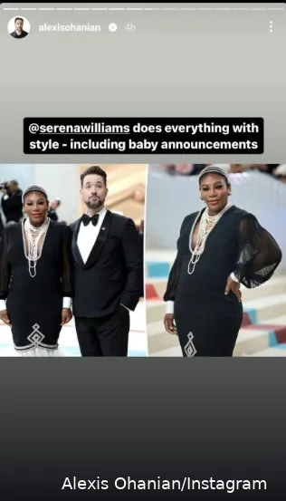 El cofundador de Reddit acudió a las redes sociales poco después del anuncio y elogió a su esposa por hacerlo todo con estilo. Ohanian publicó una foto de él y Williams posando juntos en el evento, mientras la industria de la moda celebraba una de sus noches más importantes: "@serenawilliams lo hace todo con estilo, incluidos los anuncios de bebés", subtituló.