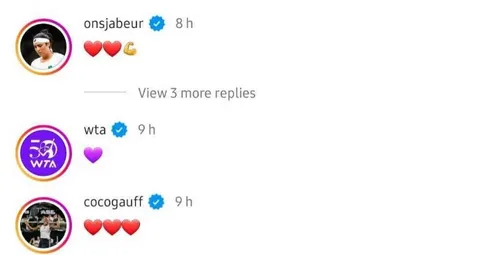 Las compañeras de Sakkari comentaron el post, mostrando su apoyo a la jugadora de 28 años. La medallista de oro olímpica Monica Puig, Coco Gauff, Ons Jabeur, AjlaTomljanovic, Alexa Guarachi, Timea Babos y Despina Papamichail fueron algunas de las personas que expresaron su solidaridad: