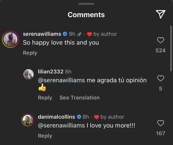 "Tan feliz amo esto y a ti", escribió Serena Williams en la sección de comentarios del post de Instagram de Collins. Respondiendo a Williams, Collins escribió: "@serenawilliams ¡¡¡Te quiero más!!!".