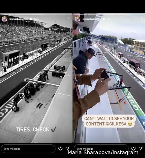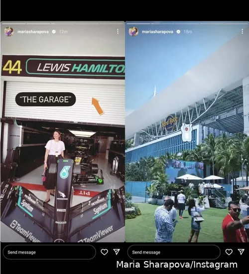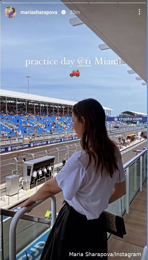 Sharapova compartió imágenes de su visita al Hard Rock Stadium con su esposo, donde estuvieron de paseo y viendo los entrenamientos, y la 5 veces campeona de Grand Slam tomó sus redes sociales para compartir el momento: "Día de entrenamiento @f1 Miami", escribió Sharapova en sus historias de Instagram con una imagen de ella viendo el entrenamiento.