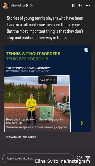 Compartió una historia en su Instagam subtitulándola: "Historias de jóvenes tenistas que llevan más de un año viviendo en plena guerra... Pero lo más importante es que no se detienen y continúan su camino en el tenis".